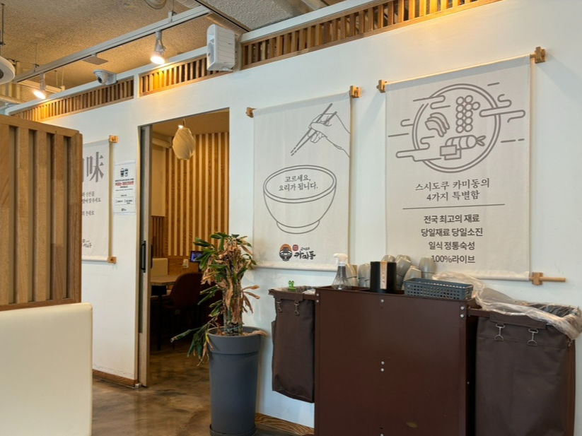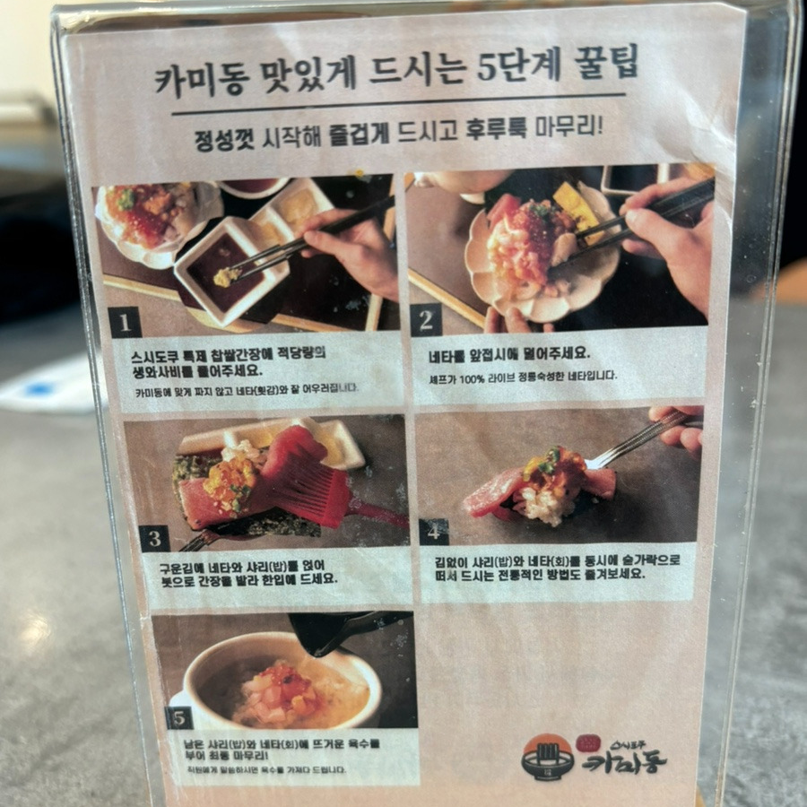 테이블에 스시도쿠 카미동에 대한 설명, 먹는 법에 대한 설명이 있어서